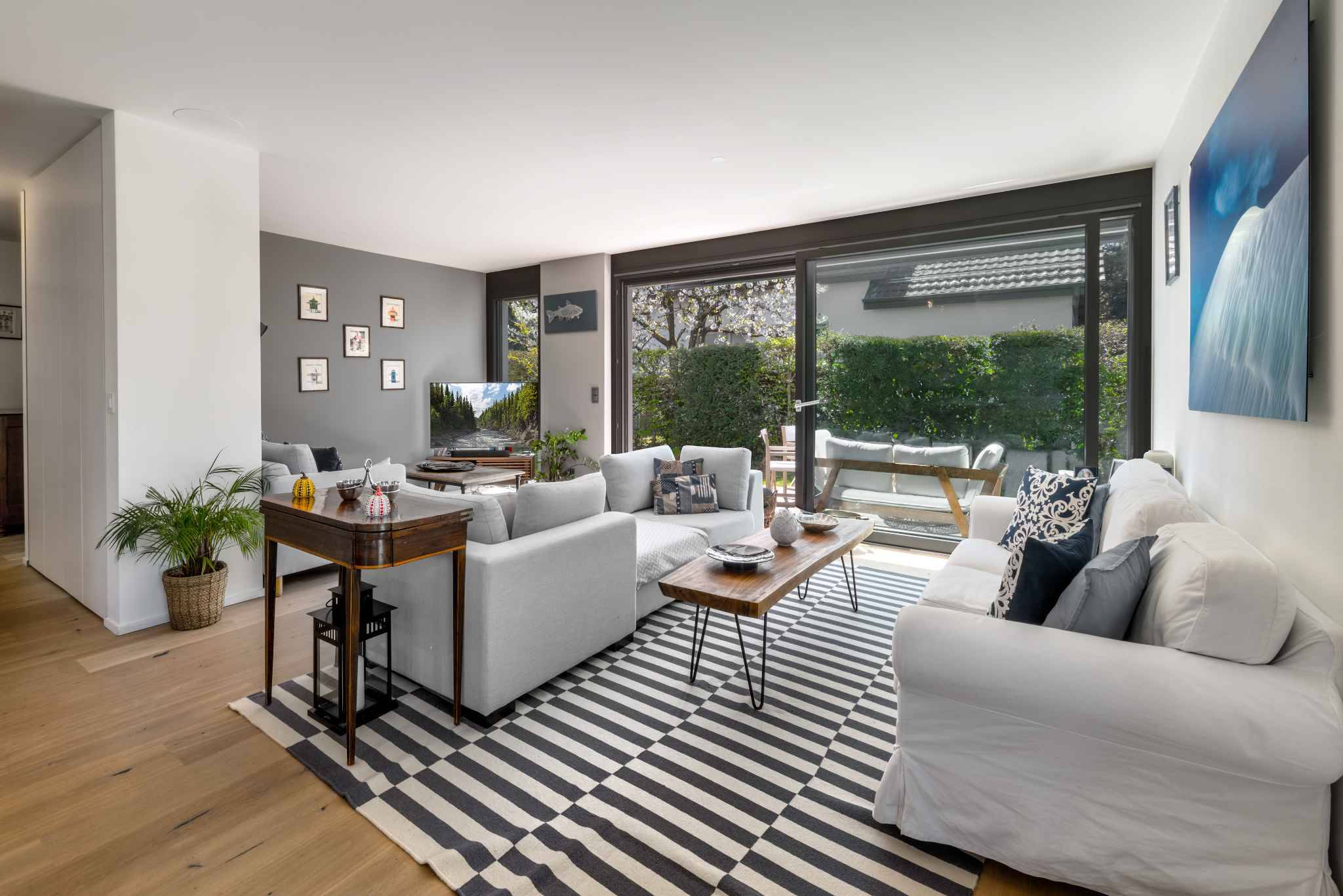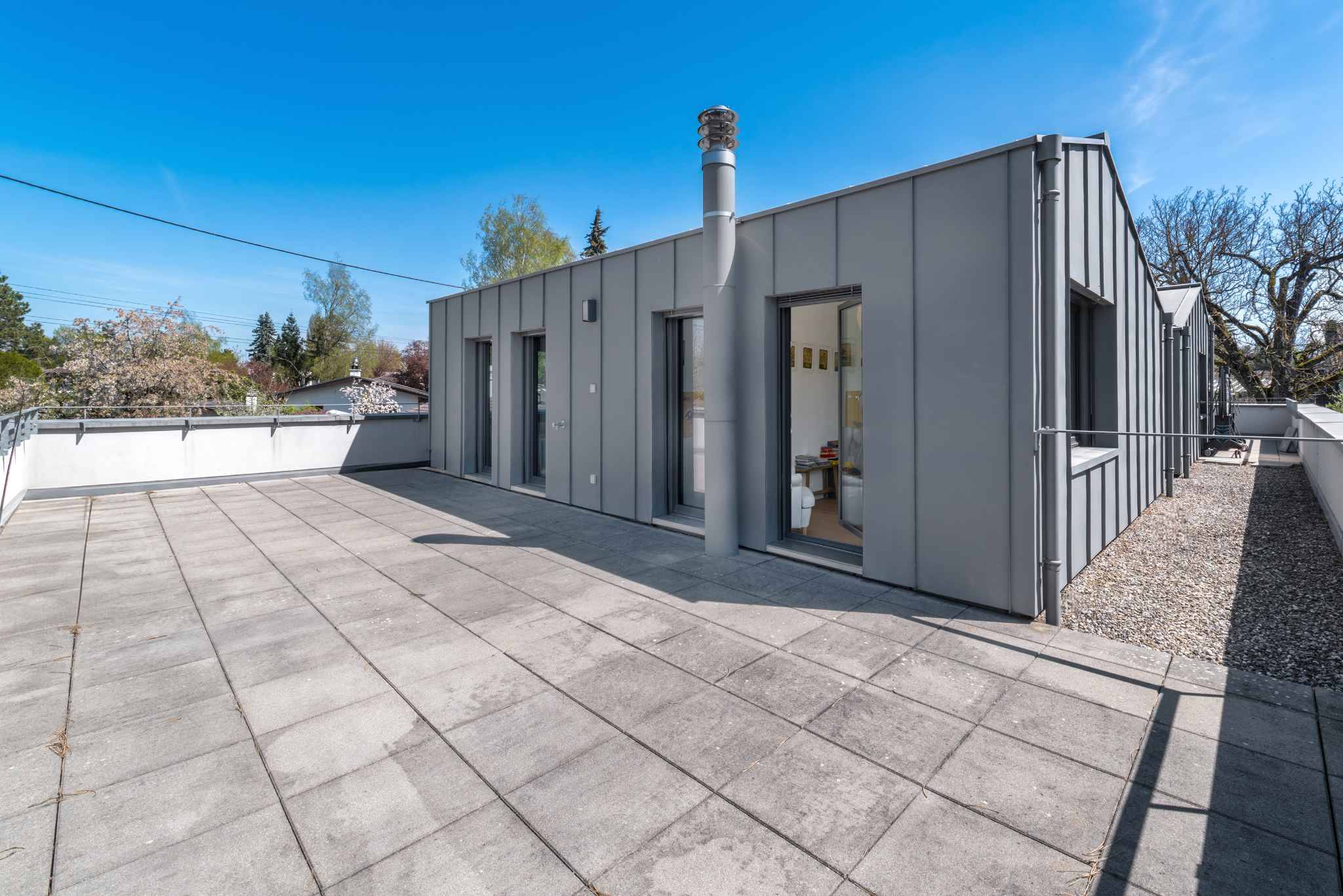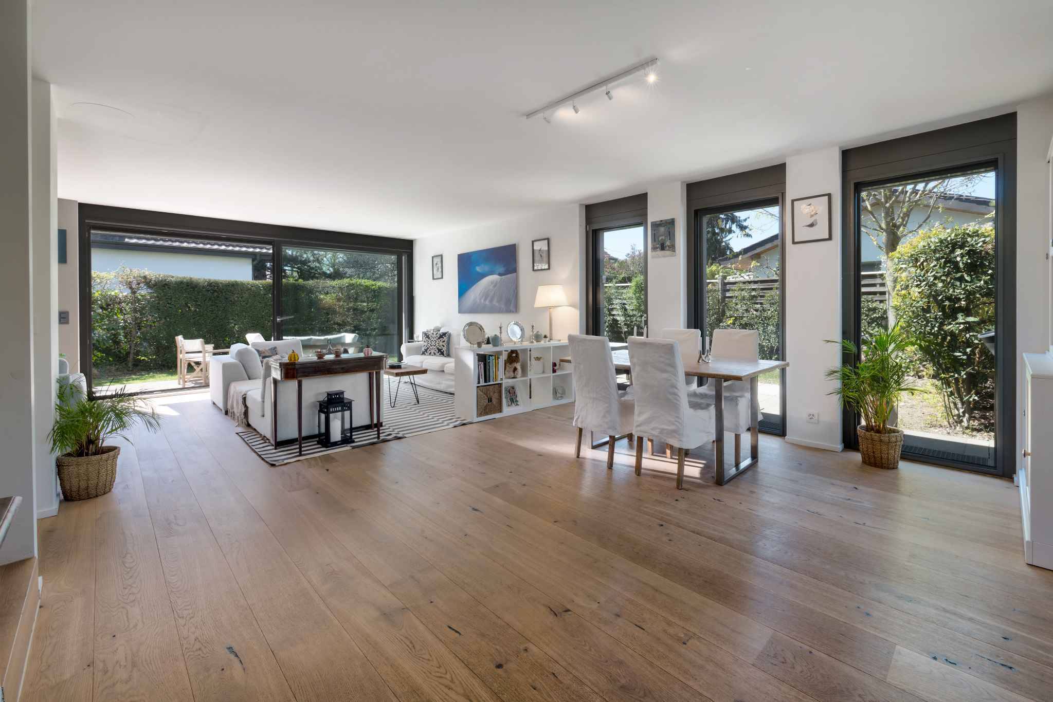 Les aménagements extérieurs comprennent un joli jardin orienté sud-ouest, deux terrasses à l'abri des regards, un garage avec porte motorisée et plusieurs places de parking extérieures.