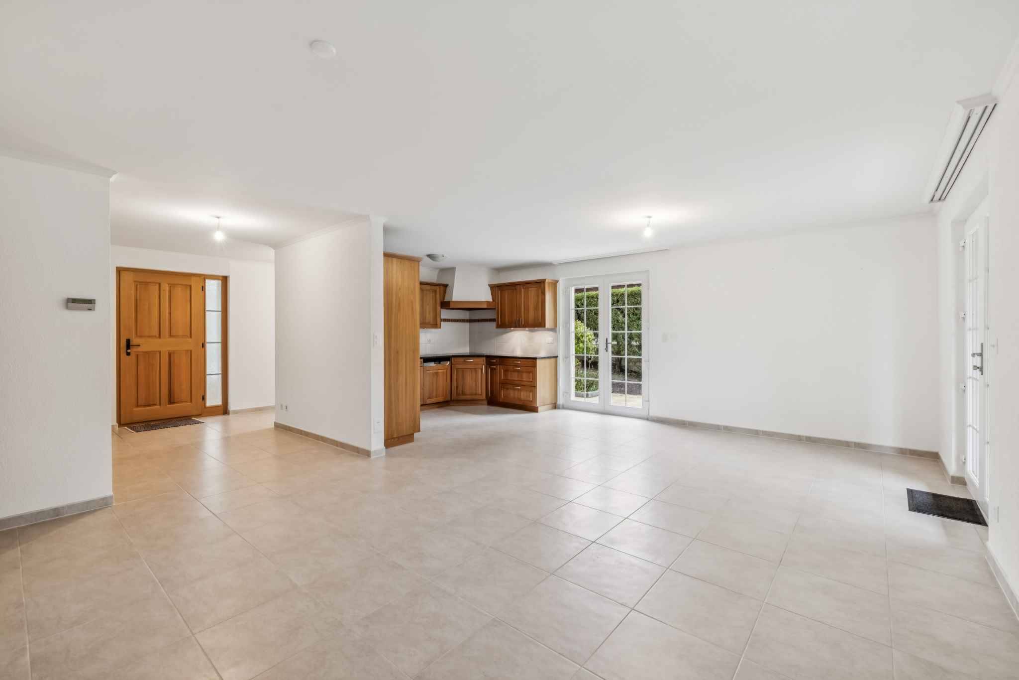 Rez-de-chaussée: entrée, toilettes visiteurs, cuisine équipée ouverte sur un grand espace salon/salle-à-manger avec accès à la terrasse et au jardin